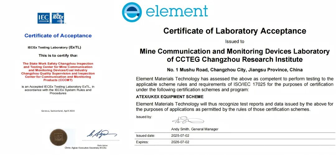 策马开新局,检测迎新绩。近日,中国煤科常州研究院检测中心(以下简称常州检测中心)在国际防爆检测资质领域实现重大突破,在顺利通过IEC Ex(国际电工委员会防爆电气产品认证)复审基础上,新增六项标准授权,涵盖IEC 60079-28(光辐射设备和传输系统的保护措施)、IEC TS 60079-46(成套设备)等内容,且成功通过英国Element认证机构现场审核,正式获得ATEX/UK Ex(欧盟/英国防爆电气产品认证)授权,以多项硬核资质迎来马年开门红。